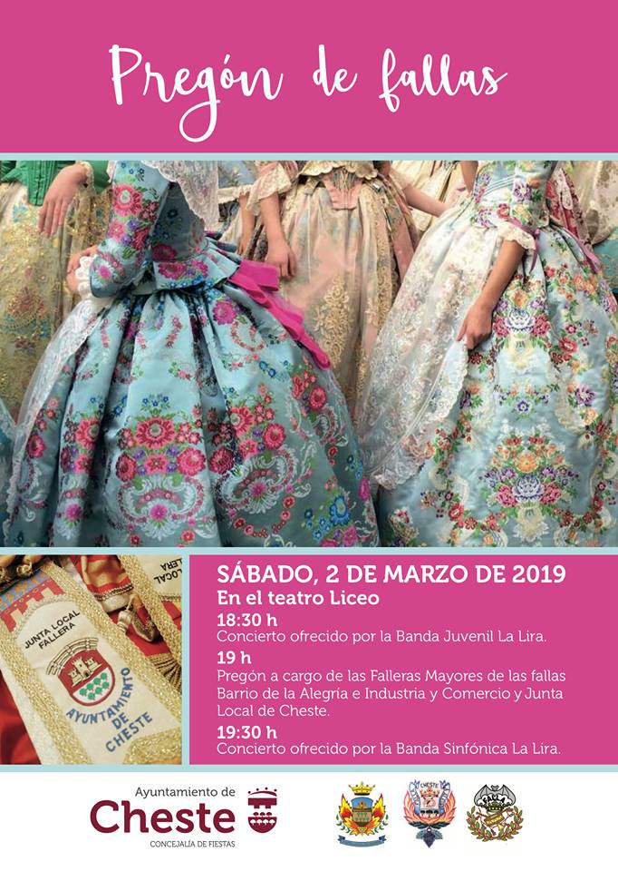 Mañana sábado el teatro Liceo acoge a las 18:30 horas el acto oficial de inicio de Fallas, el ya tradicional el Pregón de Fallas. El acto comenzará a las 18:30 horas con un concierto ofrecido por la Banda Juvenil La Lira. Una vez finalizado el concierto, a las 19 horas, se celebrará el Pregón a cargo de las Falleras Mayores de las falla Barrio de la Alegría, Falla Industria y Comercio y Junta Local de Cheste. Para finalizar el acto, a las 19:30 horas, Concierto ofrecido por la Banda Sinfónica La Lira.