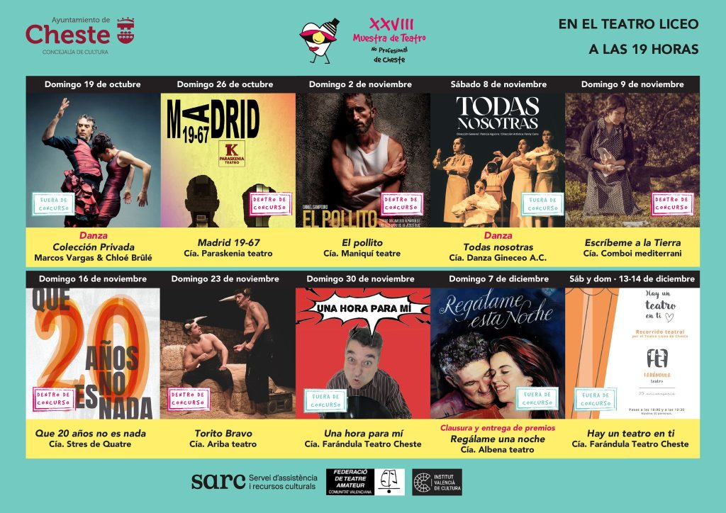 La Muestra de teatro no profesional de Cheste continúa el próximo sábado 8 de noviembre con la representación de Todas nosotras y el domingo 9 de noviembre con la representación de Escríbeme a la tierra, a las 19:00 en el Teatro Liceo.