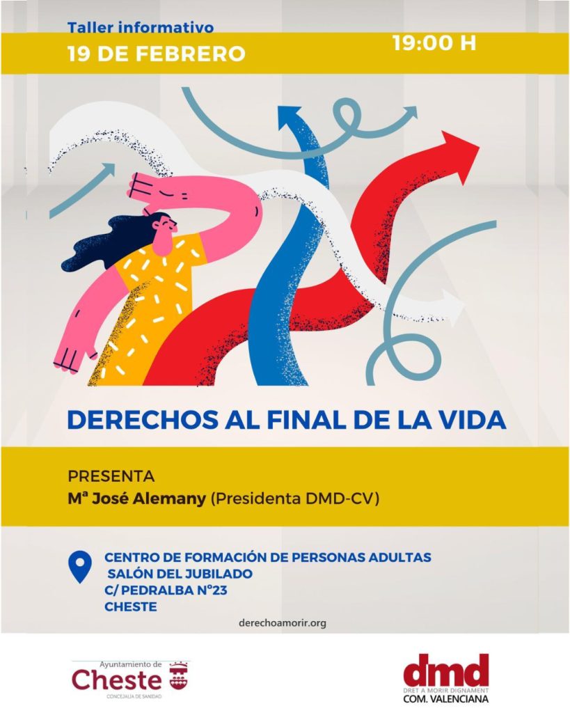 El próximo jueves 19 de febrero, a las 19:00 h, en el salón del jubilado del CFPA, Taller informativo sobre los derechos al final de la vida para conocer mejor cuáles son las opciones y cómo ejercerlas con todas las garantías. La sesión será impartida por Mª José Alemany, presidenta de DMD-CV, y es abierta a toda la ciudadanía.