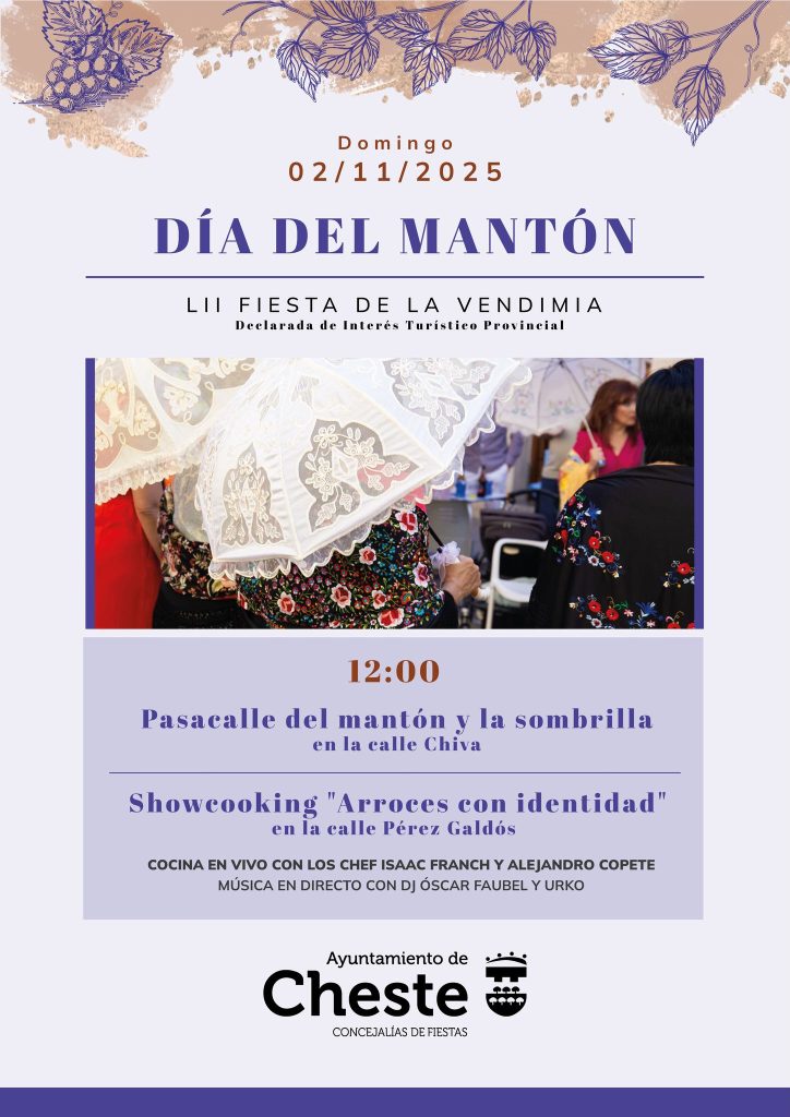 Los actos del día del Mantón, suspendidos el pasado 12 de octubre por las lluvias, se retomarán el 𝟮 𝗱𝗲 𝗻𝗼𝘃𝗶𝗲𝗺𝗯𝗿𝗲, 𝗱𝗼𝗺𝗶𝗻𝗴𝗼, 𝗮 𝗹𝗮𝘀 𝟭𝟮:𝟬𝟬.