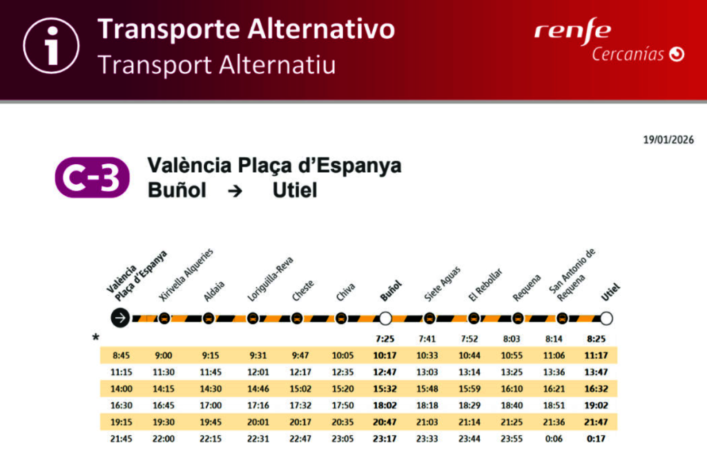 También Renfe ha publicado los nuevos horarios que entrarán en vigor el próximo lunes 19 de enero, correspondientes al transporte alternativo en la línea C-3, con circulación entre: