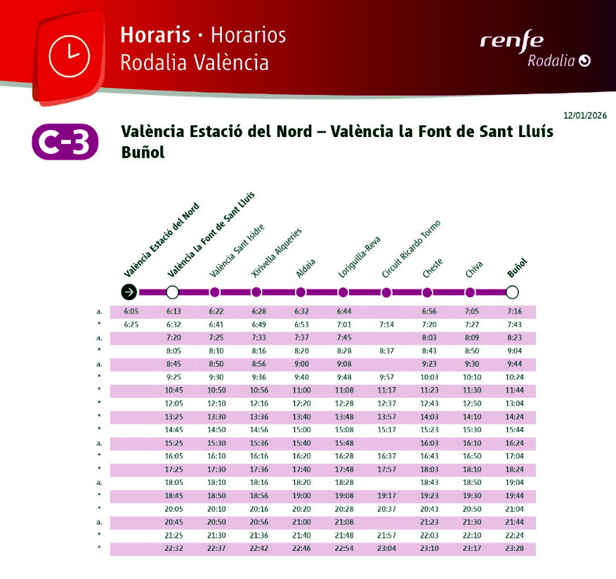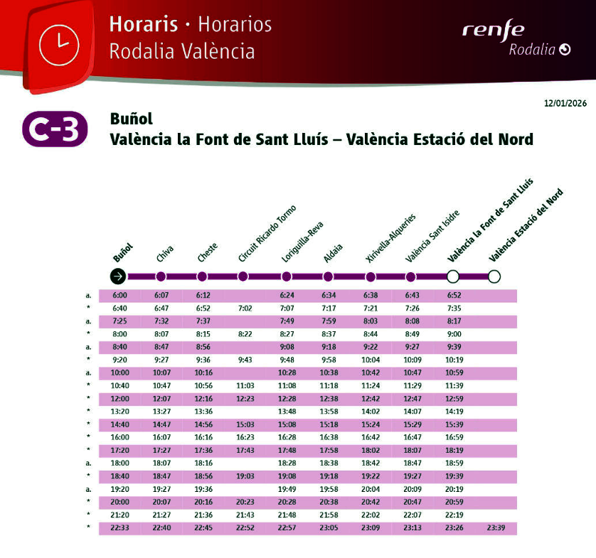 Renfe ha publicado los nuevos horarios que entrarán en vigor este lunes 19 de enero para los servicios de la línea C-3 de Rodalia València, con circulación entre: