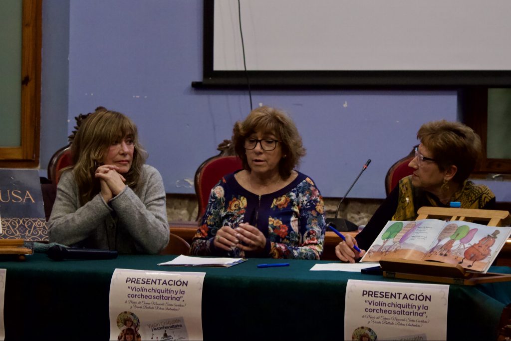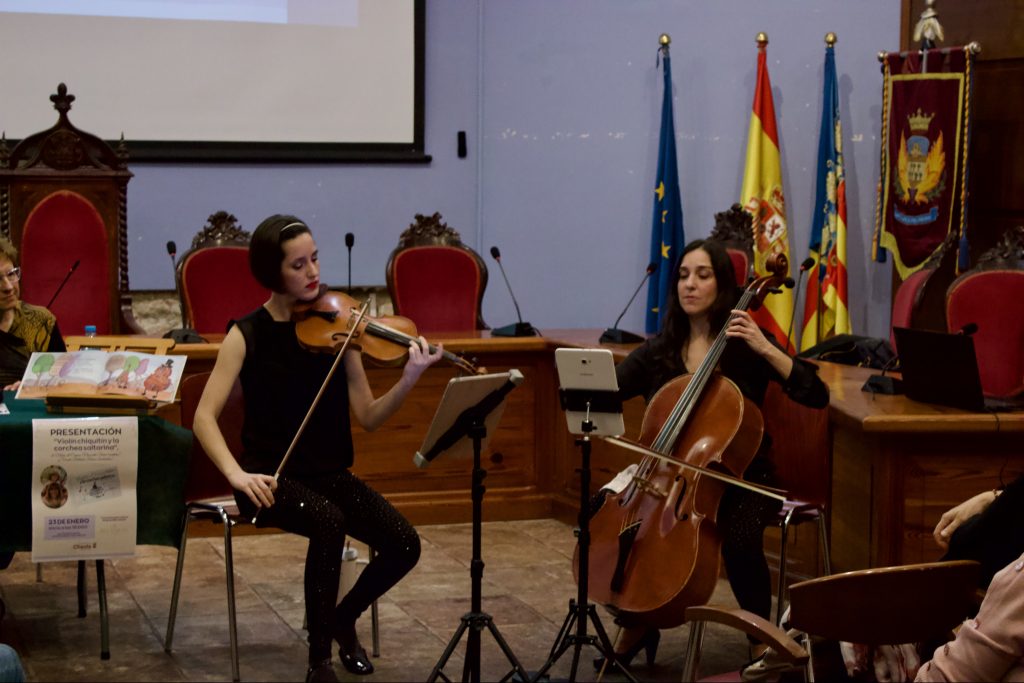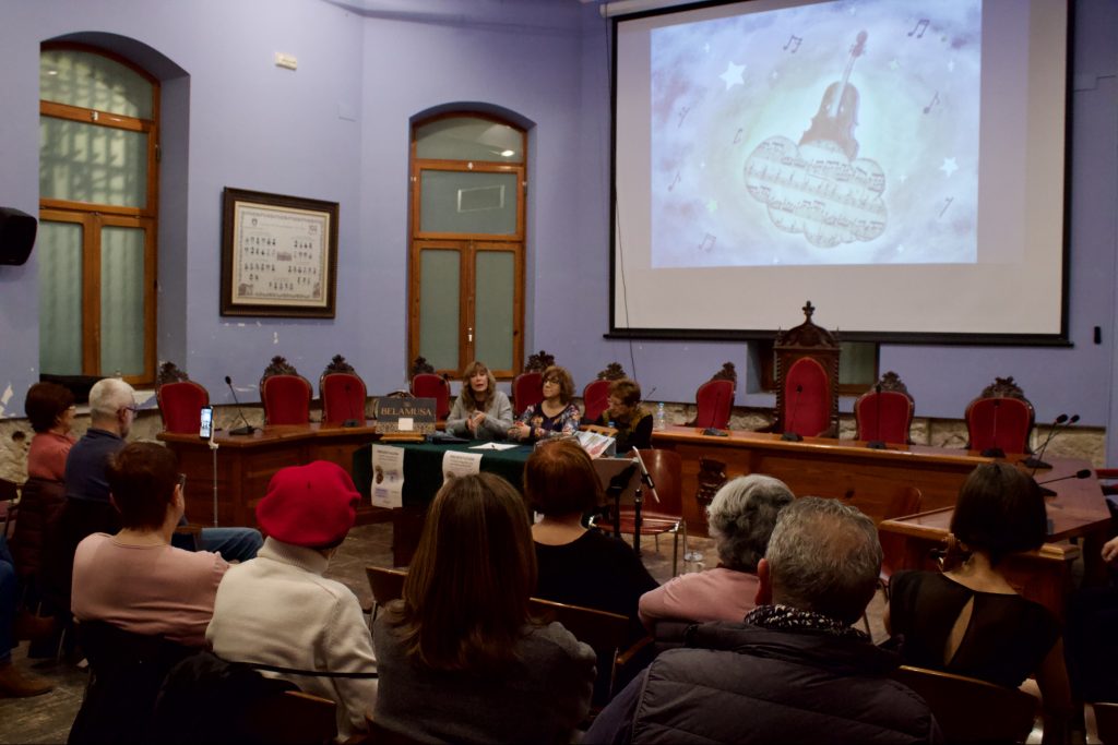 El salón de actos del Ayuntamiento acogió la presentación del cuento “El violín chiquitín y la corchea saltarina”, una obra llena de amor por la música, escrita por María del Carmen Moscardó Sierra e ilustrada por Vicenta Ballester Rehués.