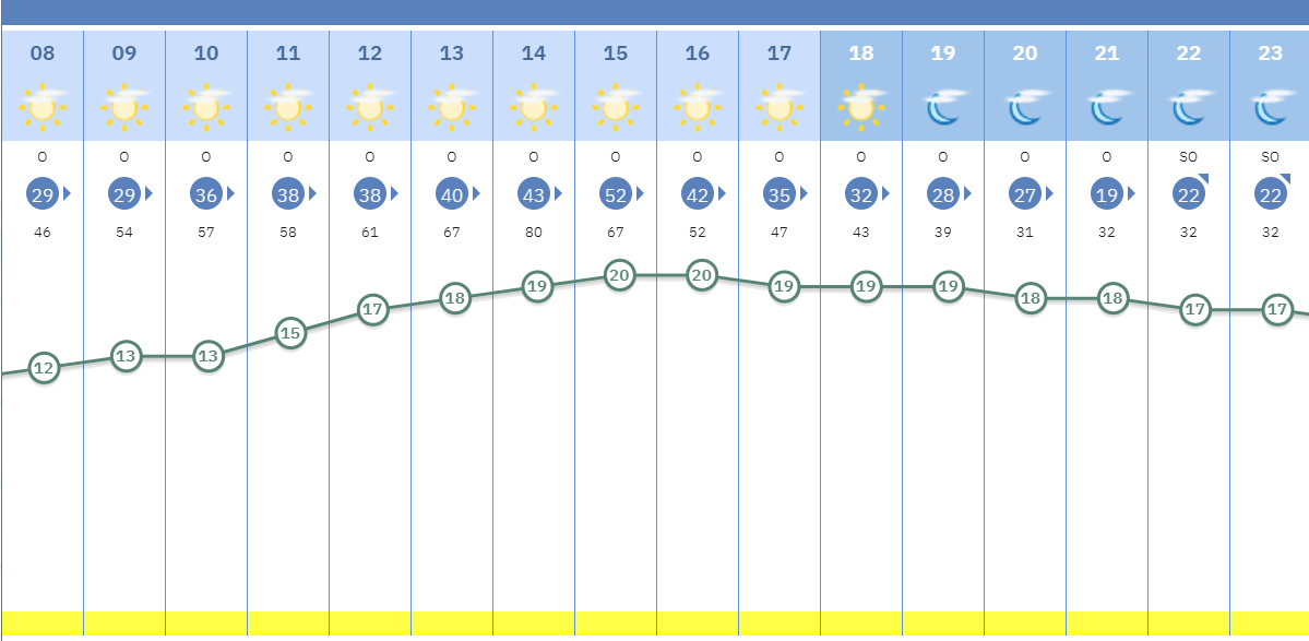 Hoy lunes tendremos un día con predominio de sol y nubes altas. El viento volverá a ser protagonista con rachas de hasta 80 km/h. La temperatura se situará entre 12 y 20 grados.