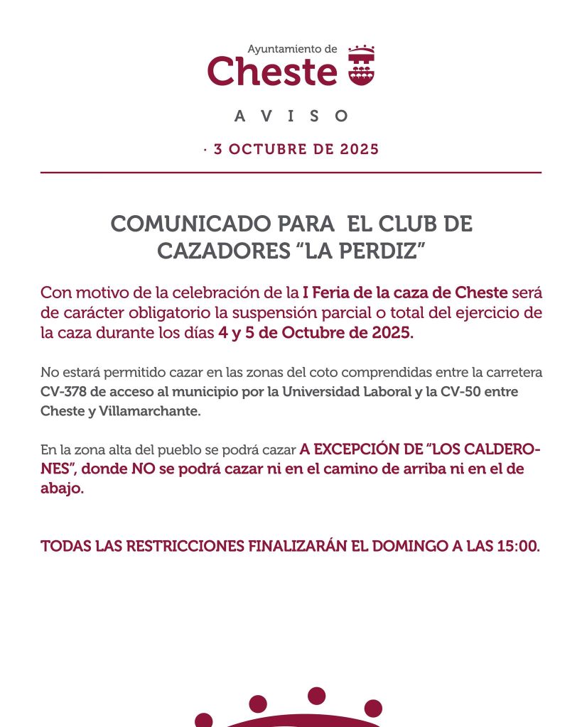 La Concejalía de Deportes ha organizado una Feria de la Caza Deportiva los días 4 y 5 de octubre, en el parque de La Lomiquia, con un amplio programa que contempla la celebración del Campeonato Autonómico de Xarnego Valenciano, el sábado; así como una Copa de Cheste y una Copa Joven, el domingo.